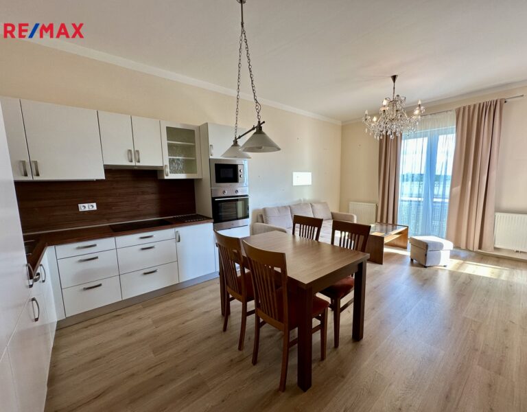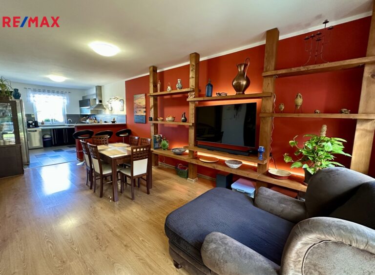 O patro výše je rozměrný obývací pokoj s jídelnou a kuchyní (celkem o výměře 43,4 m2), spíž, hala a nově zrekonstruovaná koupelna s moderním velkým sprchovým koutem a WC. Z obývacího pokoje je vstup na terasu s pergolou a grilem a krásnou okrasnou zahrádku.