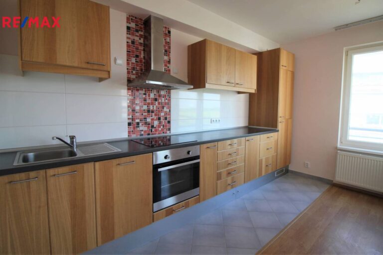 Byt je vybaven kuchyňskou linkou s vestavěnými spotřebiči (myčka, sklokeramická varná deska, elektrická trouba a lednička).