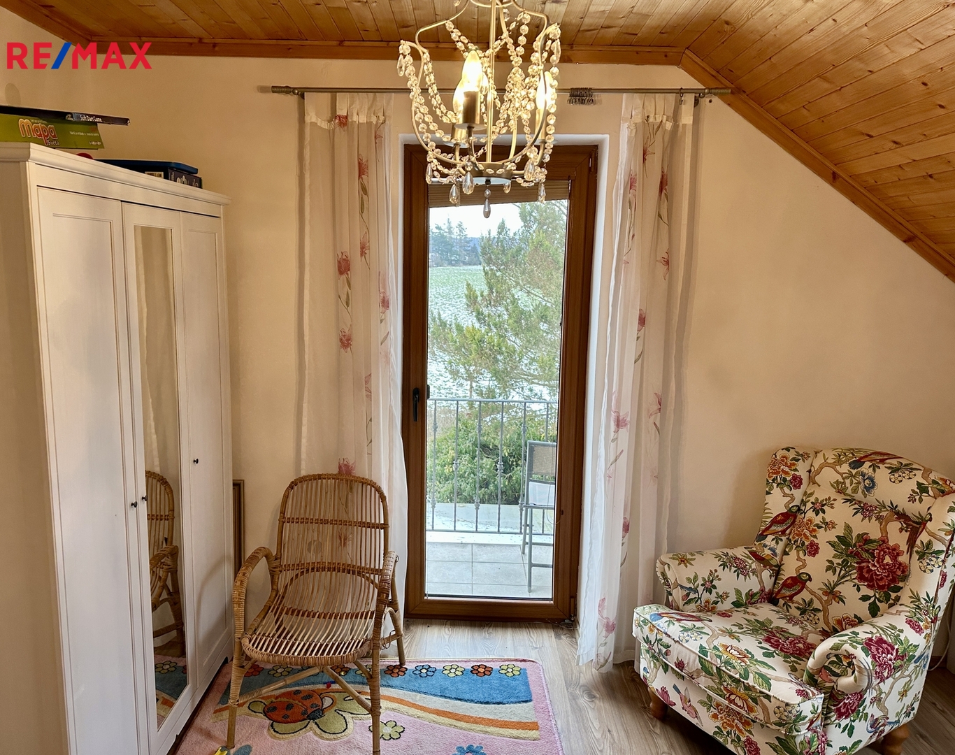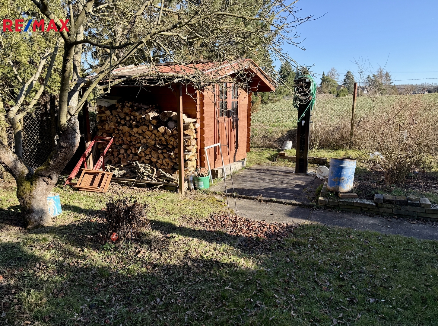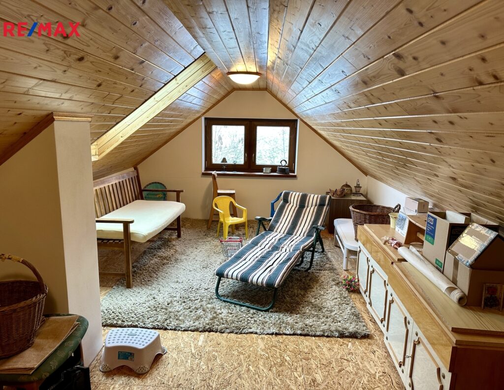 Menší domek má vstupní verandu/terasu, pokoj s kuchyní 14,4 m2, další pokoj 11,4 m2, koupelnu s WC a prostor v podkroví, který je ideální k přespávání. Vytápění je zde kamny nebo je možnost i instalovat přímotopy.