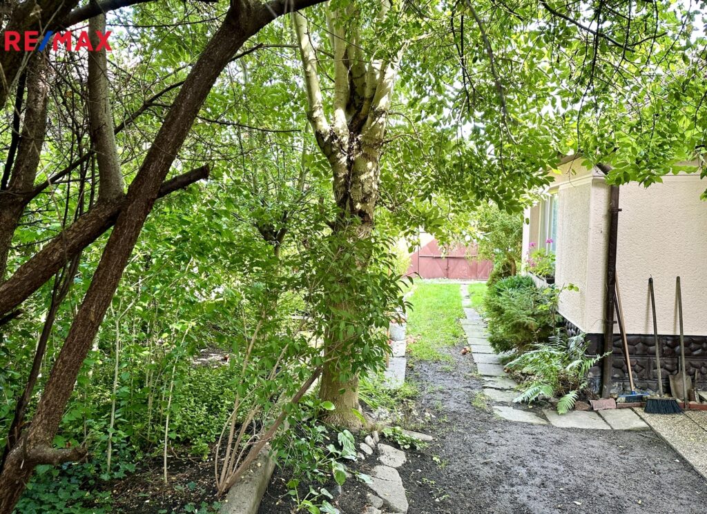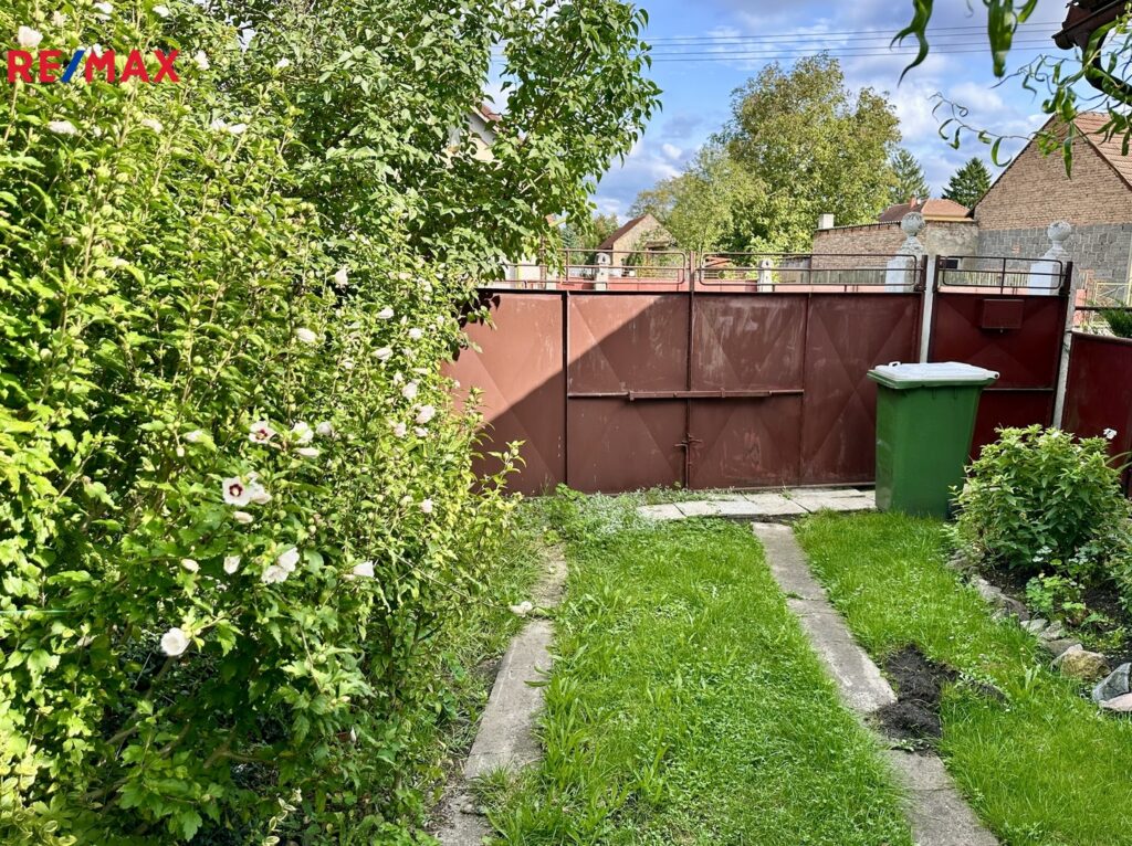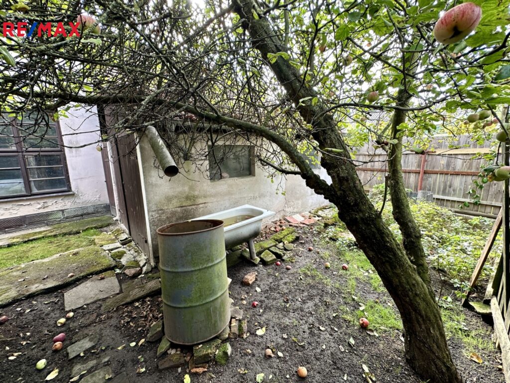 Nabízená nemovitost má malou předzahrádku a zahrádku s jabloní.