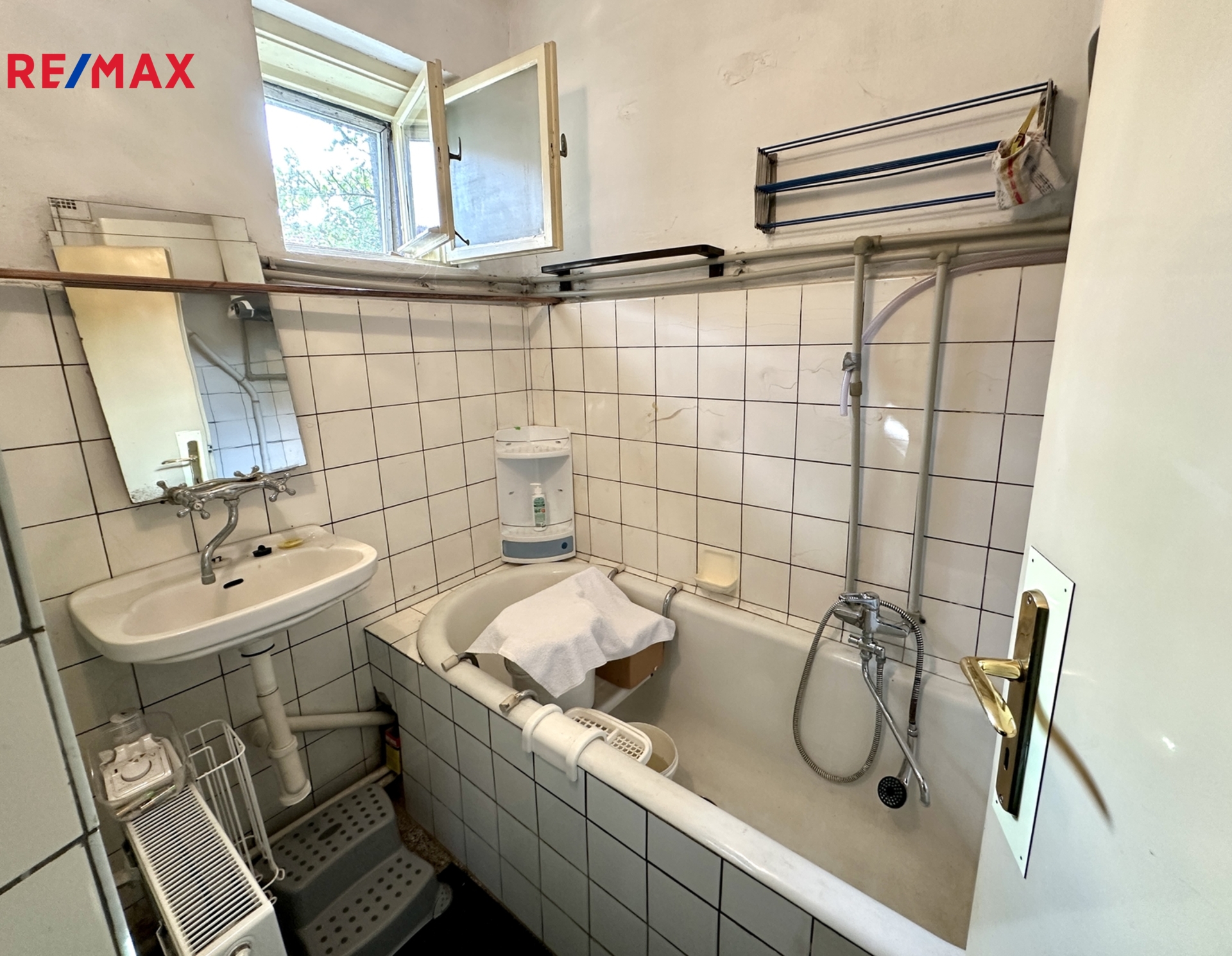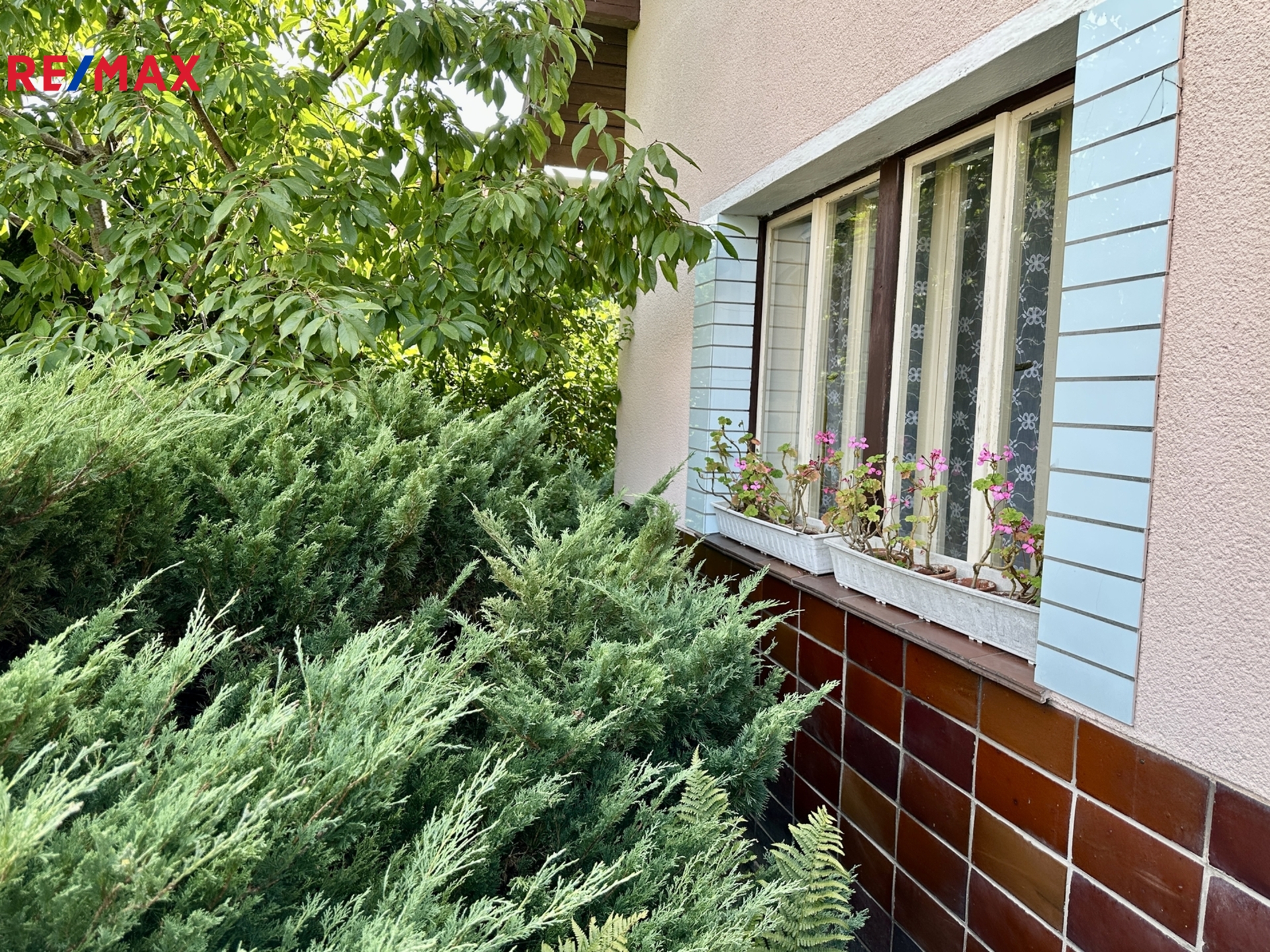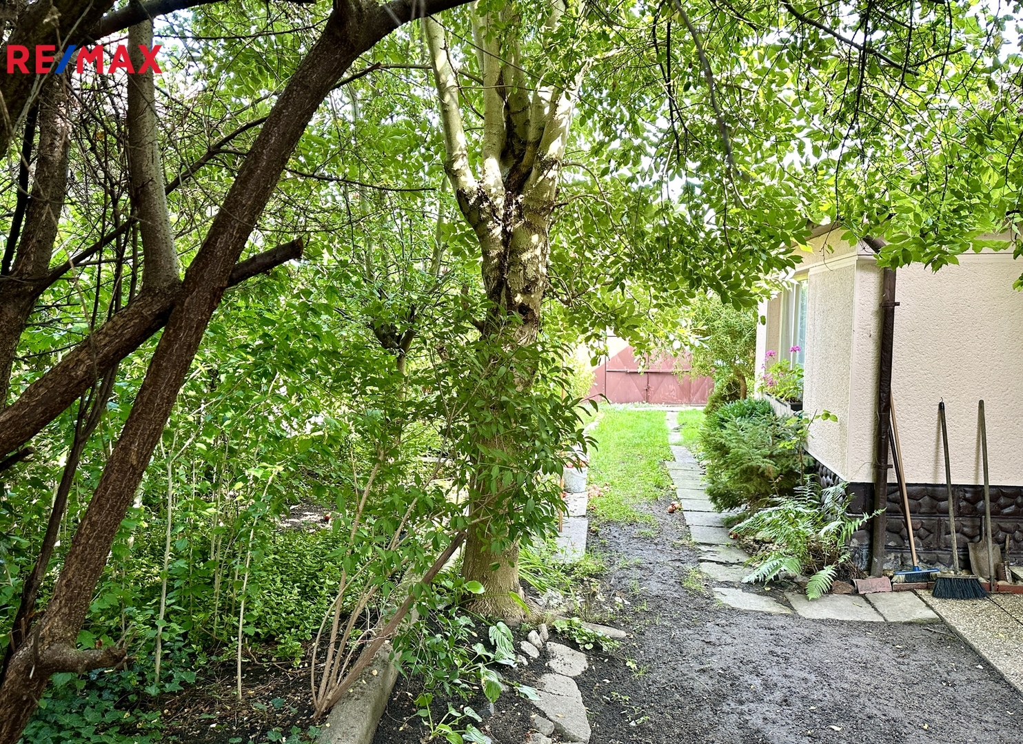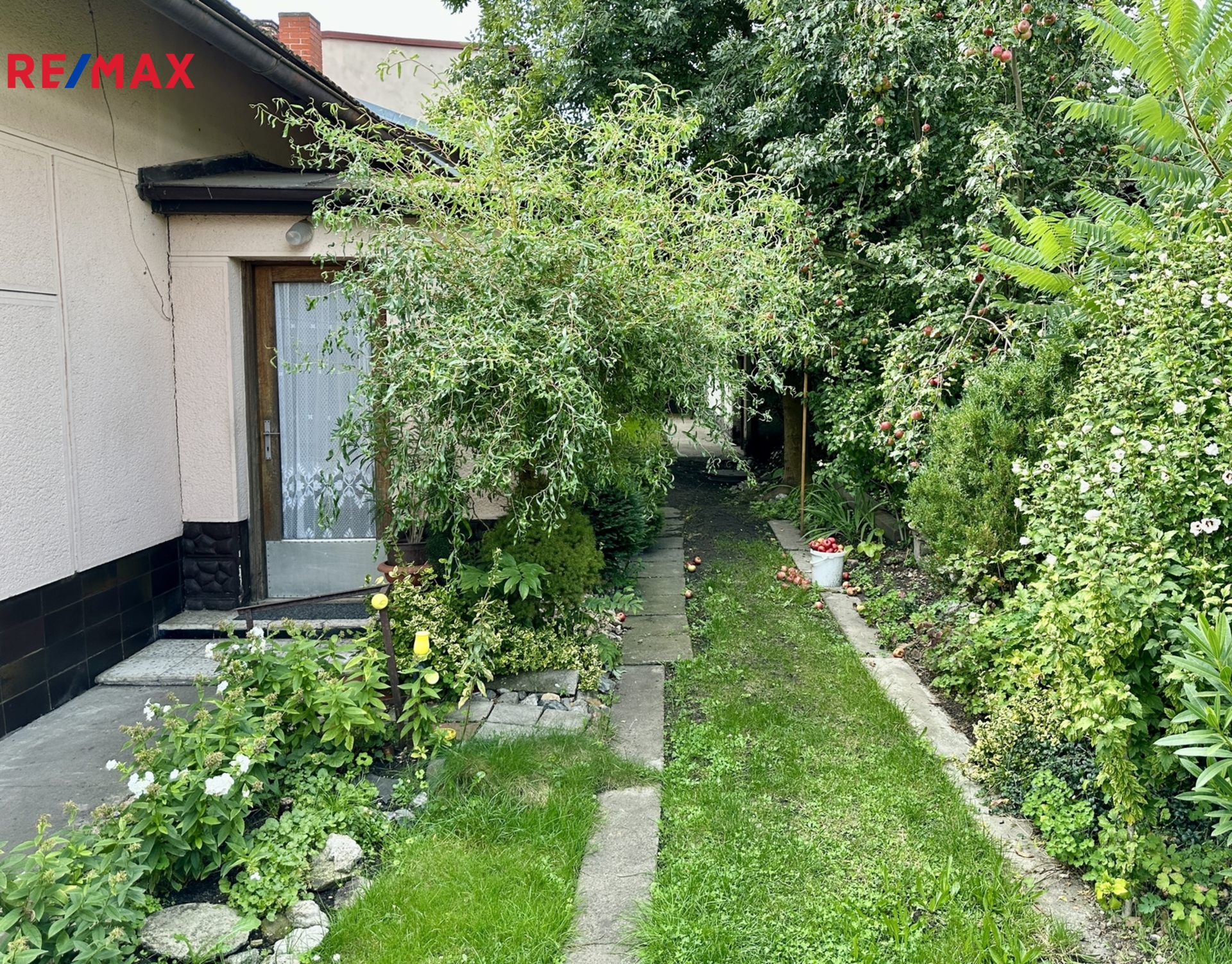 Nabízená nemovitost má malou předzahrádku a zahrádku s jabloní.