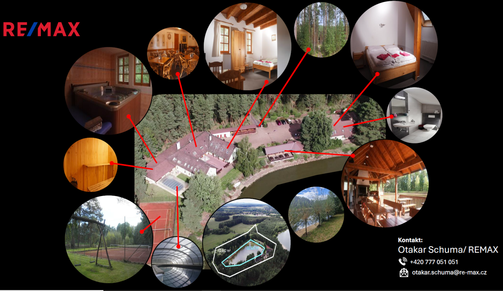 Hlavní budova (o užitné ploše cca 550 m2) se 17 pokoji s ubytovací kapacitou 44 lůžek + 17 přistýlek. Vedlejší budova (o užitné ploše cca 280 m2) se 4 pokoji s ubytovací kapacitou 12 lůžek a ubytováním pro rodinu provozovatele/ správce areálu vč. garáže na 2 auta. Restaurace pro 44 osob s jídelnou a kuchyní, zastřešený venkovní gril a posezení až pro 100 hostů vč. terasy u jezera, tenisový kurt (antuka), bazén se slanou vodou, vířivka, sauna, masáže, rybolov a další sportovní vyžití (kolárna, půjčovna rybářského vybavení, venkovní ping pong, dětské hřiště, udržovaná pláž).