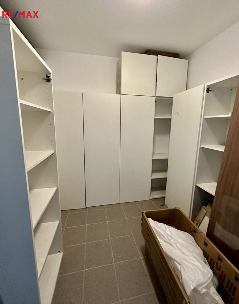 Byt je vybaven: kuchyňská linka s kvalitními vestavěnými spotřebiči, čtyři velké vestavěné skříně, policový systém v šatně a komoře. Na oknech jsou předokenní venkovní, elektricky ovládané, žaluzie. Vstupní dveře jsou bezpečností.