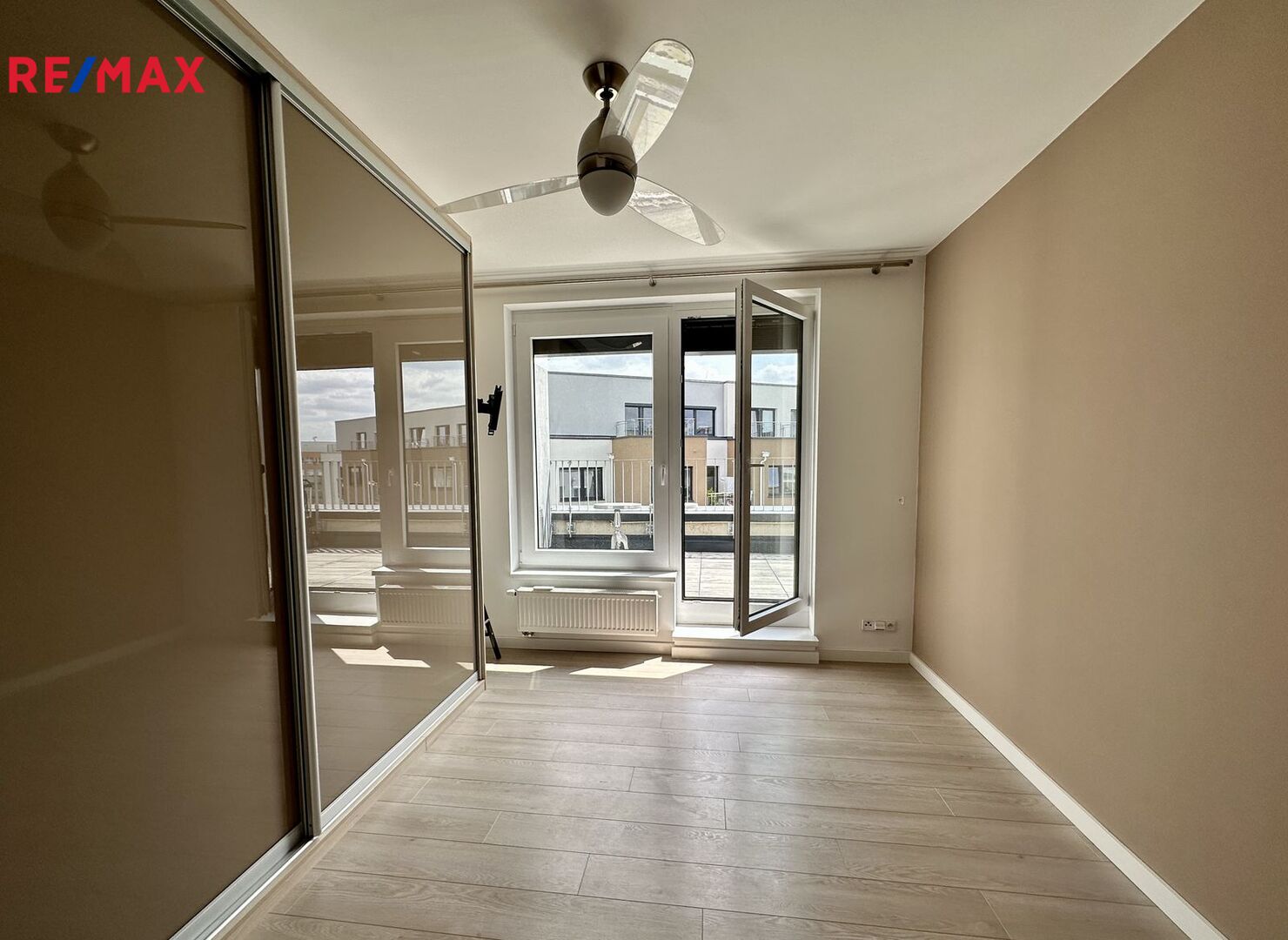 Prostorný byt má obývací pokoj s kuchyňským koutem, tři ložnice, dvě koupelny, samostatné WC, halu, šatnu a komoru (6,4 m2) umístěnou na stejném patře jako byt. Ze všech pokojů je vstup na terasu a z jedné ložnice je vstup na lodžii.